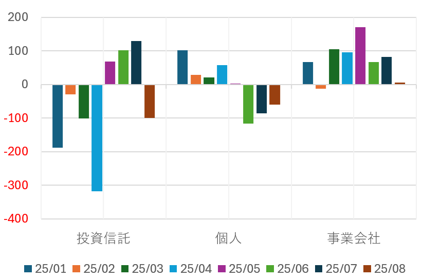 トランプ米大統領の関税政策によって、米国長期金利が4月以降再上昇し、外国人投資は5月から7月まで売り越しとなっていた。8月にはFRBの利下げ観測が強くなり買い越しに転じている。