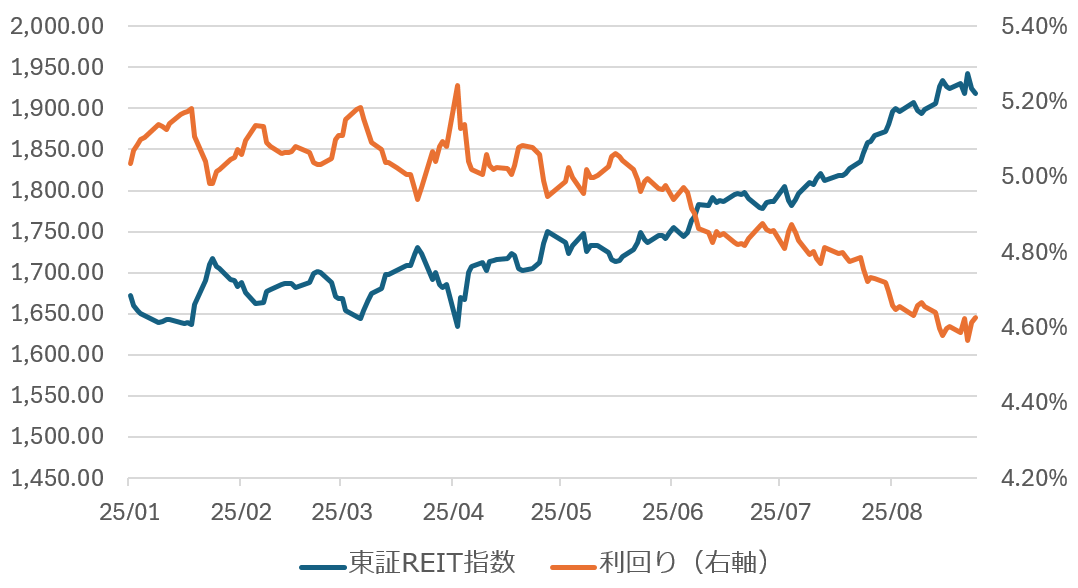 8月末まで続いていたJ-REIT価格の上昇基調は、一服する状態となっている。東証REIT指数は、図表1の通り6月上旬から8月下旬まで上昇が続き、月末は1,917ポイントで取引を終えた。2022年11月以来となる月末時点で1,900ポイントを超えた。