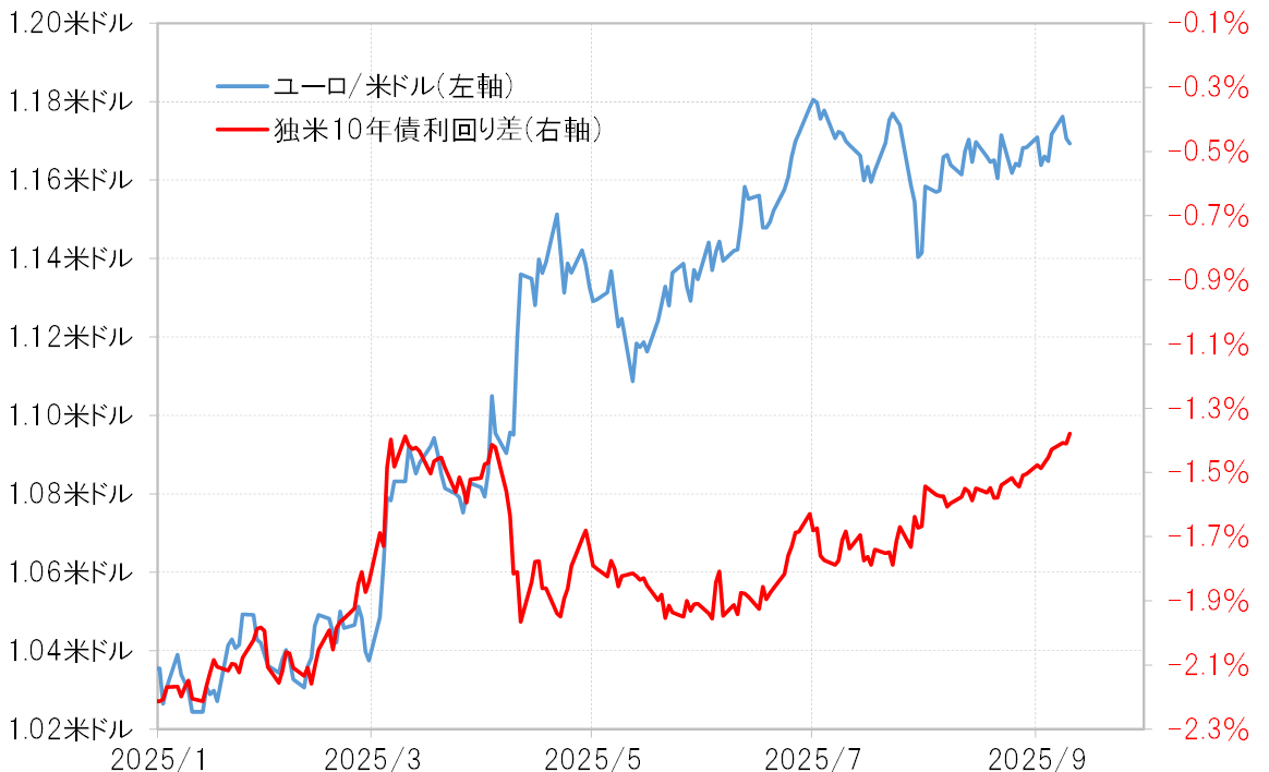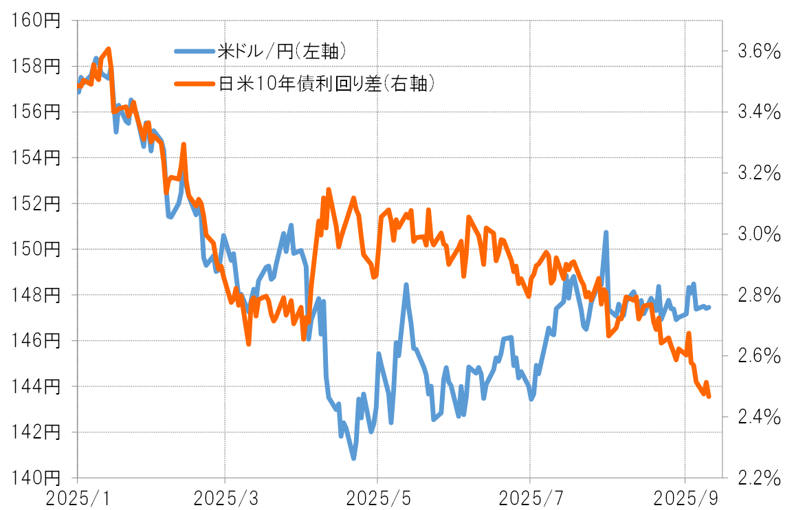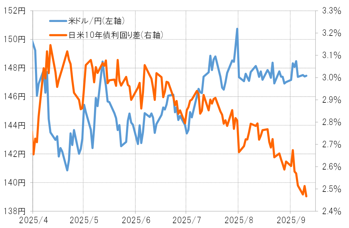 米ドル/円のように、日米金利差より米ドル高・円安圏でのかい離が広がっているのは、関税交渉などを受けた日本からの対米投資の増加をはじめ、基本的に「金利差とは無関係の米ドル買い」の影響とも考えられなくもない。