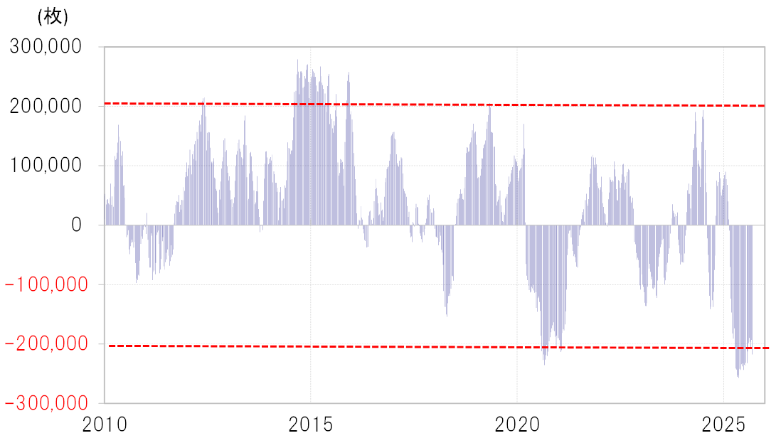 たとえば、CFTC(米商品先物取引委員会)統計の投機筋の米ドル・ポジションを円とユーロの2通貨を対象とした結果で見ると、先週の段階で売り越しが20万枚以上と過去最高規模になっています(図表3参照)。このように米ドルが円、ユーロといった主要通貨に対して「売られ過ぎ」という状況がここ数ヶ月続いていることから、日米金利差縮小などの米ドル売り要因への反応が限られたものにとどまっている可能性はあるかもしれません。