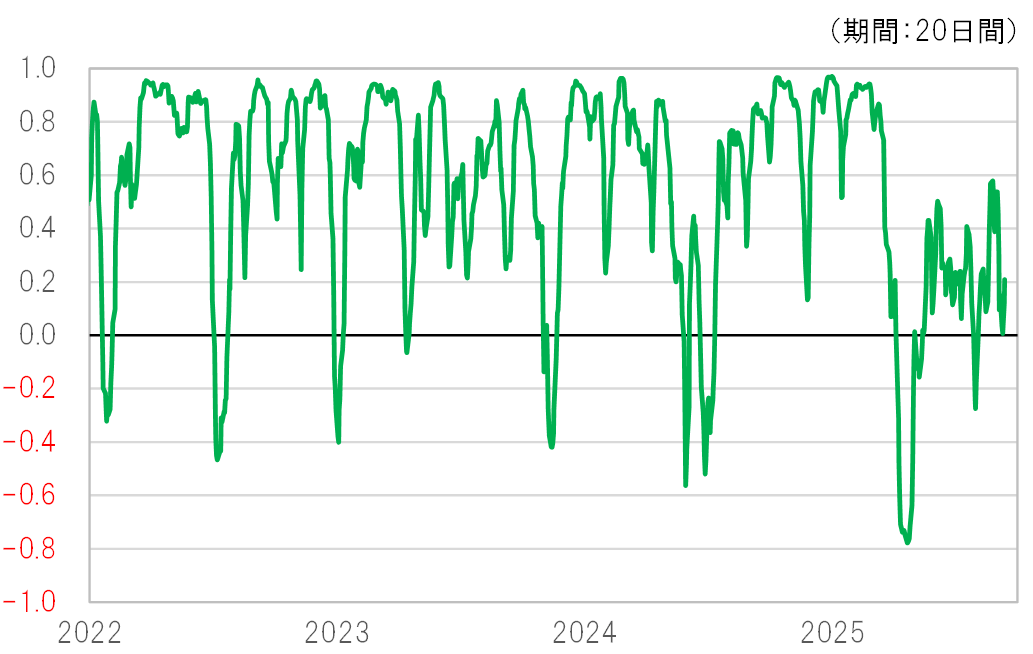 米ドル/円と日米金利差の相関係数は4月以降、基本的に0.5以下の水準で推移が続いています(図表4参照)。この係数がプラス1に近づくほど、両者はほぼ同じように動いていることを示していますので、このように0.5以下といった比較的低い水準での推移が数ヶ月にわたって続くのは、米ドル/円の金利差への反応が鈍い状況が異例なほど長期化しているという意味になるでしょう。