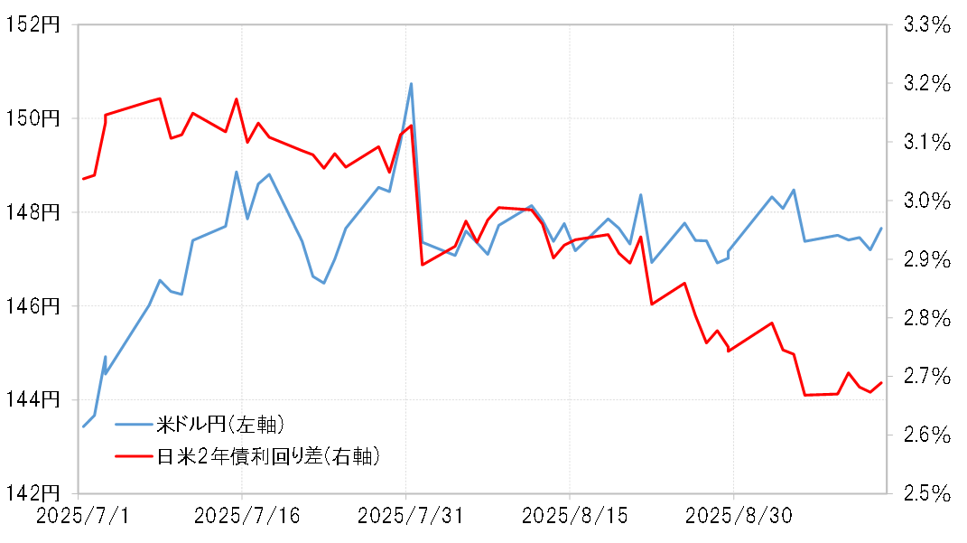 このように小動きが続いているのは、日米金利差(米ドル優位・円劣位)縮小などの米ドル安・円高要因への反応が鈍いことへの影響が大きいでしょう。先週(9月8日週)は、CPI(消費者物価指数)など米国のインフレ指標発表がほぼ予想通りの結果となりました。このことから、米利下げ再開見通しの障害にならないとして米金利は低下し、日米金利差は縮小しましたが、それに対する米ドル安・円高の反応は限られたものにとどまりました(図表2参照)。