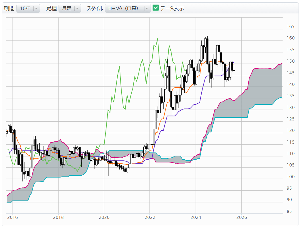月足の米ドル円チャートを一目均衡表の遅行スパン(現在の価格水準を26ヶ月前にずらして描いたラインチャート)といっしょに見ると、ちょうど遅行スパンと当時の価格水準(ローソク足)が接しています。