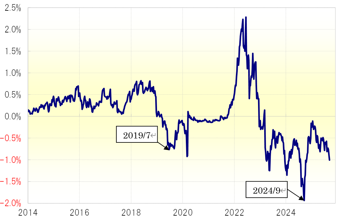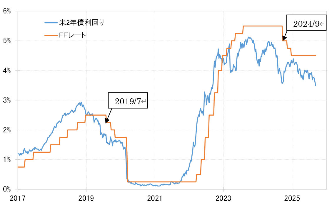 これまでのところ米2年債利回りは、FFレート誘導目標上限を最大で1%程度下回っている。これを見る限り、2024年9月の利下げ開始前ほどには利下げを織り込み過ぎた金利低下ではなさそうだ。