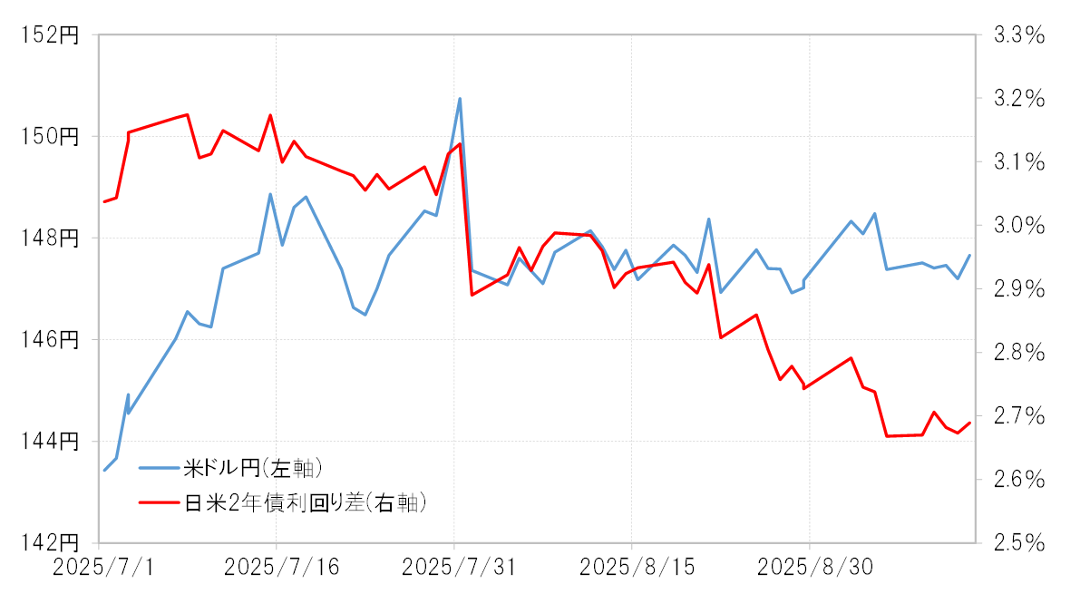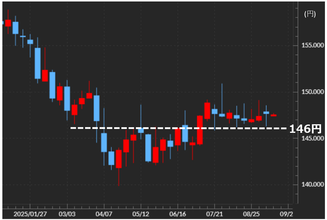 テクニカルな観点からすると、2025年に入ってからの米ドル/円は146円という水準が、これまでかなり重要な分岐点になってきた(図表4参照)。4月のトランプ米大統領の相互関税発表をきっかけとした米ドル/円の急落は、146円割れで加速しました。その後はしばらく146円が上値の抵抗線となっていたが、その146円を突破すると7月末には150円まで一段高となった。そして、8月以降は146円台でサポートされる状況が続いてきました。