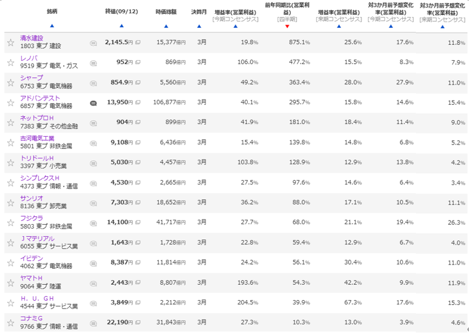 比較的売買が行いやすいように流動性を考慮して東証プライム上場で時価総額800億円以上としています。更に、前年同期比(営業利益)の高い方から並び変えています。
