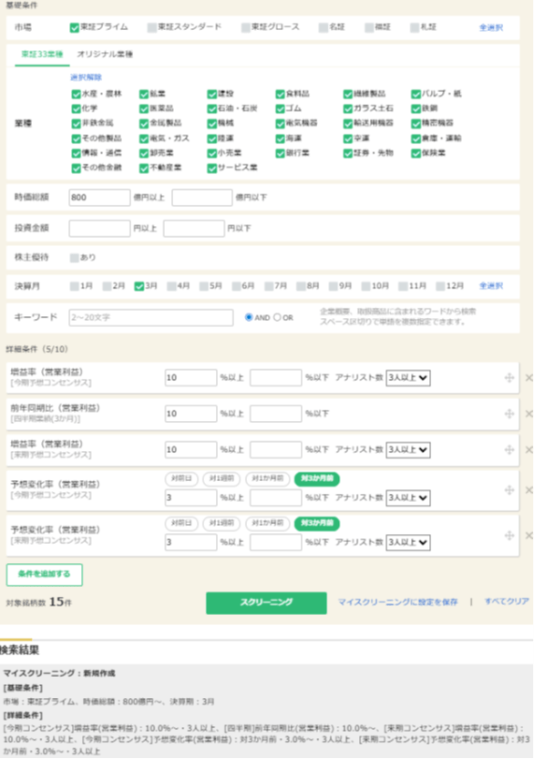 そこで実際に筆者がマネックス証券のウェブサイトで提供している「銘柄スカウター」の10年スクリーニングを用いて、業績モメンタム戦略の参考銘柄を抽出しました。