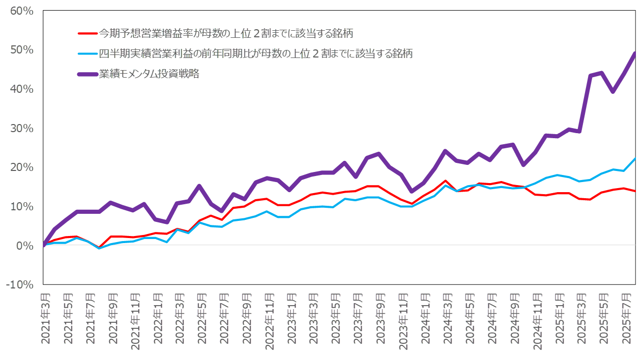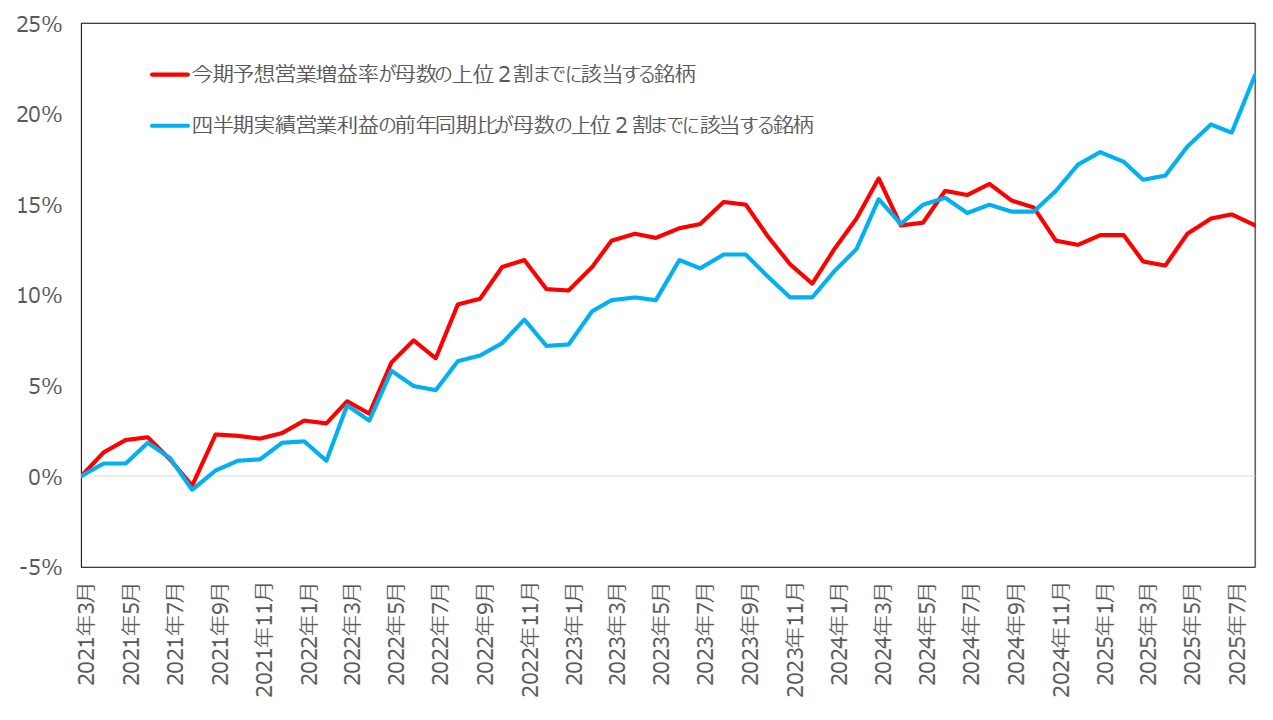 ところで図表1では更に注目したいポイントがあります。2025年8月の終着点で青線グラフが赤線グラフを上回っていることです。青線グラフは四半期実績営業利益の前年比を基準とした上位銘柄のパフォーマンスを示しています。先ほど、“株価は過去の実績より将来を評価して動く”ことをお伝えしました。しかし四半期ベースの比較的短いサイクルの場合は、実績の業績モメンタムでも、その後の株価の動きと深い関係があります。これは次のような背景があります。