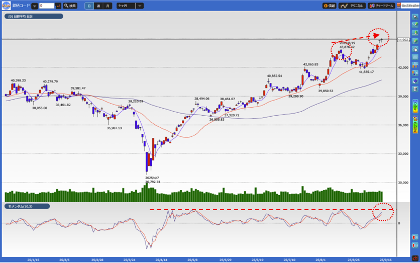 9月16日までの日経平均の値動きをもとに考えてみたいと思います。16日の株価はすべての移動平均線を上回るとともに、過去最高値を4日連続で更新して終えています。また、すべての移動平均線が上向きになっており、上昇トレンドが継続中です。