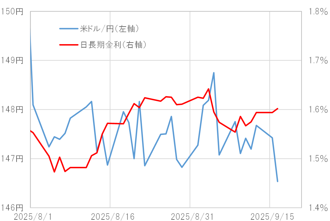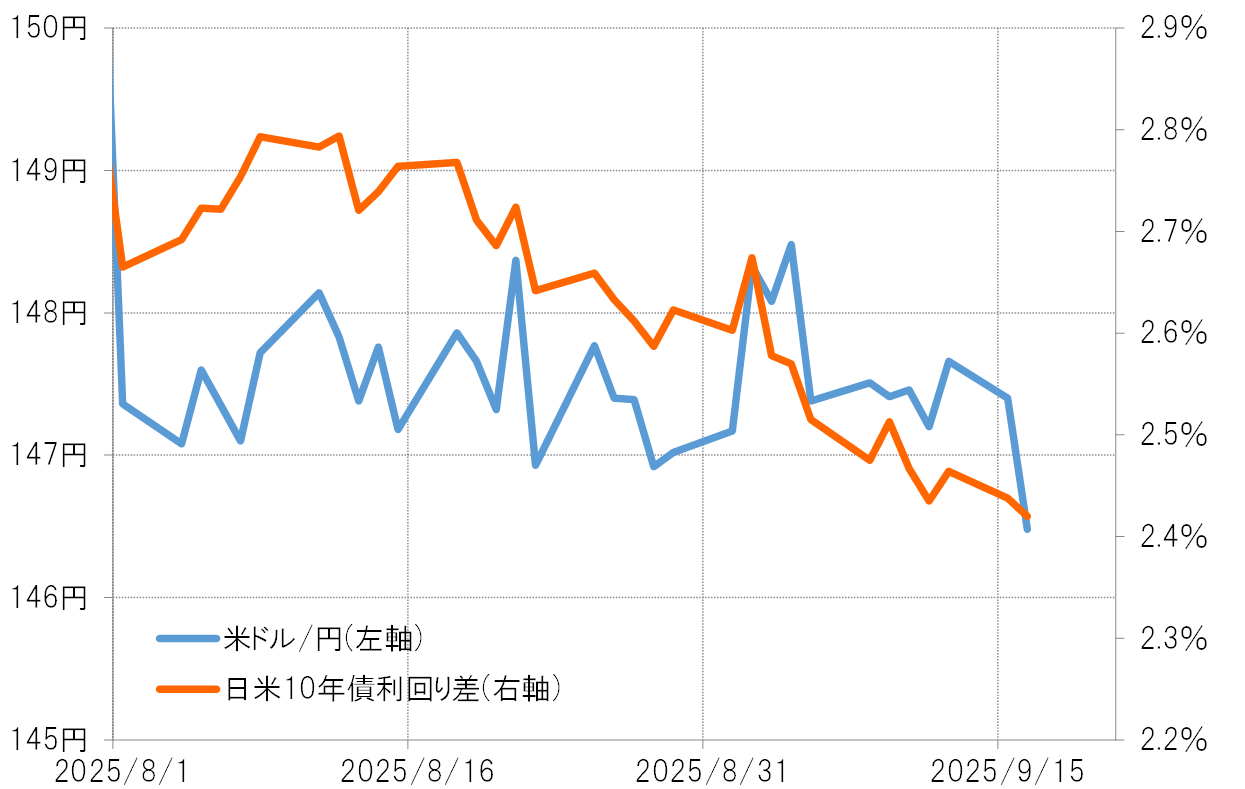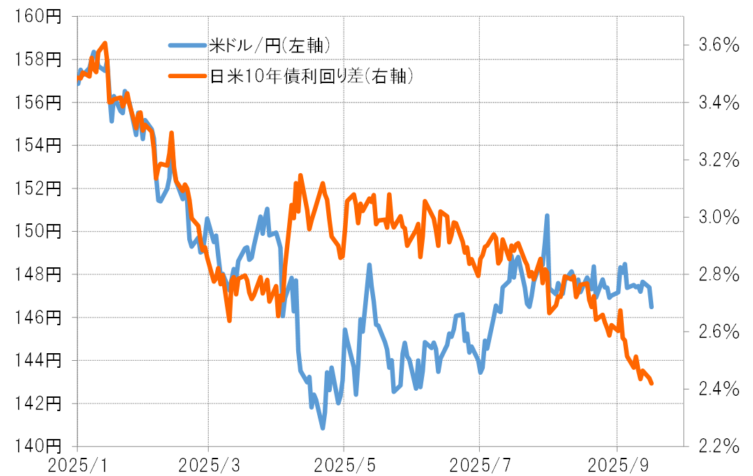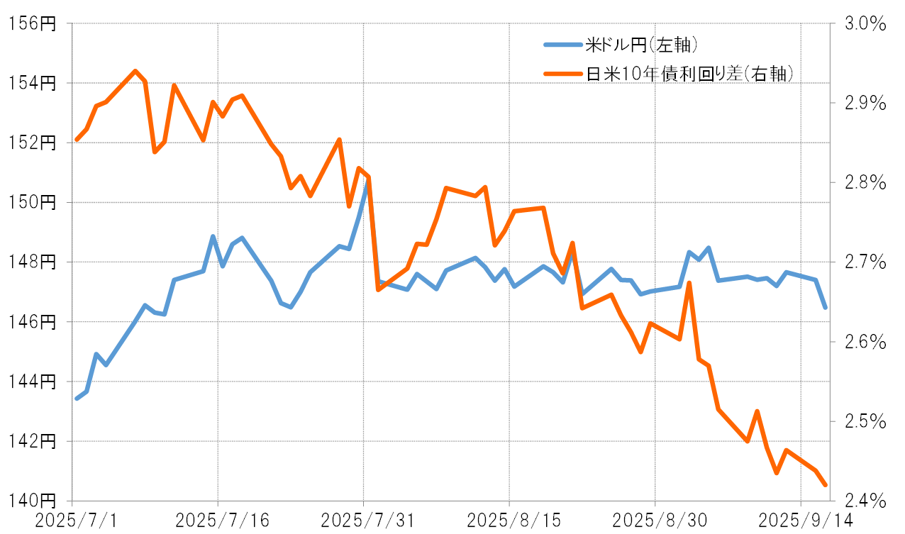 7月の日本の参院選で連立与党が大敗し、少数与党に転落したことで、野党との連携強化の観点から消費税減税など財政拡張の可能性が高まった。それは財政赤字拡大への懸念から、債券利回り上昇の円買いではなく、債券価格下落を受けた円売り要因とされ、金利差縮小に米ドル安・円高が追随しなかったということではないか。ただ、そうした金利差と米ドル/円の関係に、微妙ながら最近変化の兆しが出てきた。