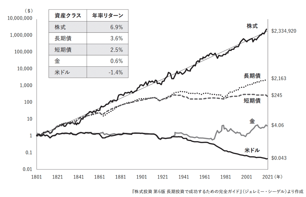 株式投資の名著として知られるジェレミー・シーゲル著『株式投資 第6版 長期投資で成功するための完全ガイド 』(日経BP)には、1802年から2021年までの200年以上にわたって1ドルを株・長期国債・短期国債・金・米ドルの5つの資産に投資した場合の年次の実質トータルリターン指数の推移が示されています。