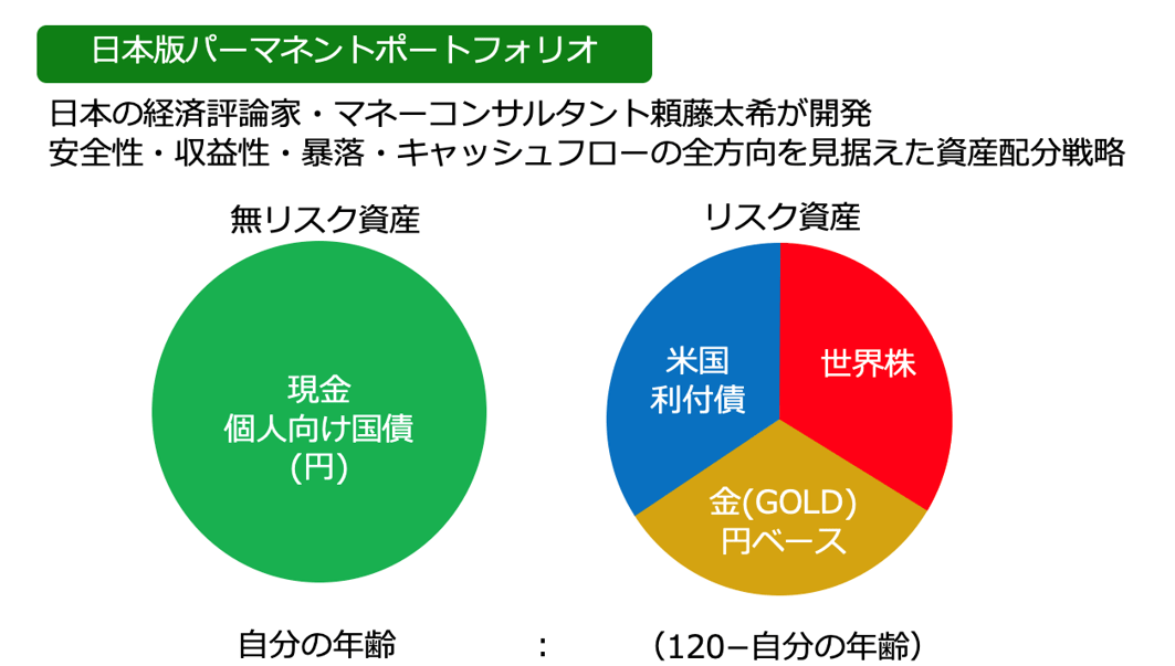 「120の法則」を活用して、現金とパーマネントポートフォリオ(=リスク資産)の配分比率を決定します。120の法則は、無リスク資産(現預金・個人向け国債)とリスク資産(株・投資信託など)の割合を「自分の年齢」と「120から自分の年齢を引いた数字」に対応させて保有する考え方です。