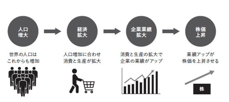 人口増大→世界経済拡大→企業業績拡大→株価水準上昇
