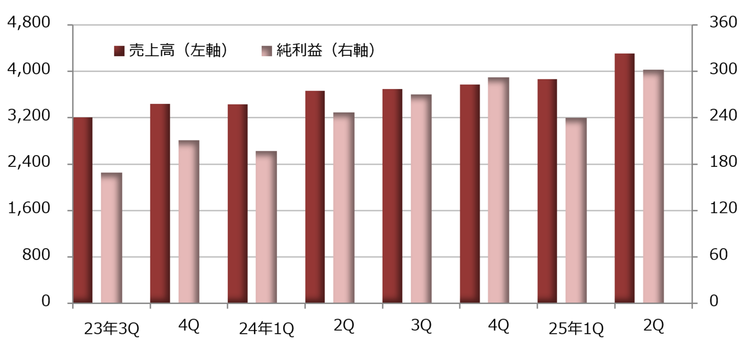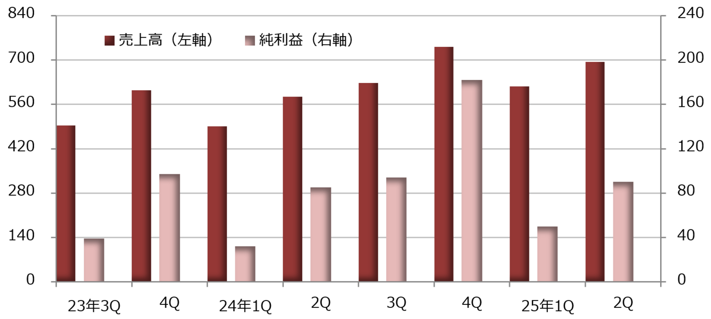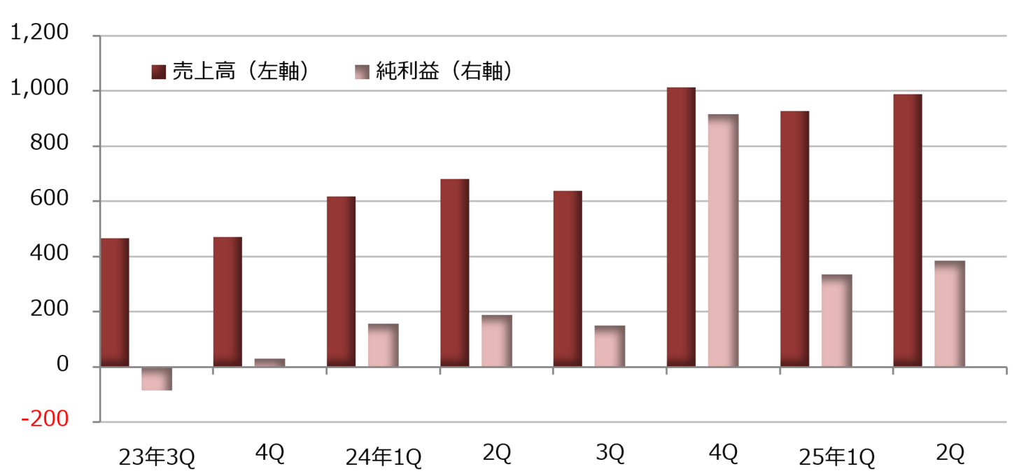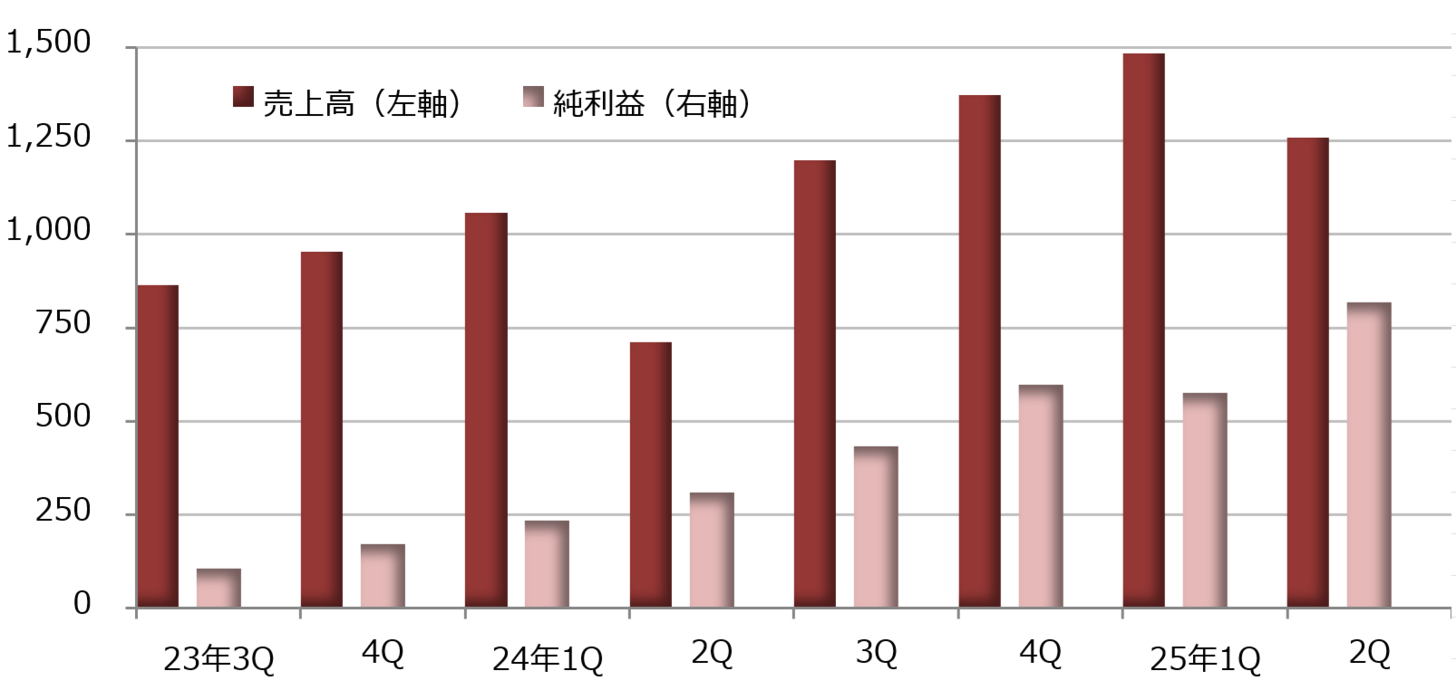 業績は好調で、2025年4-6月期の売上高は前年同期比77%増の12億5900万ドル、純利益は164%増の8億2000万ドルです。依然として急成長が続いています。