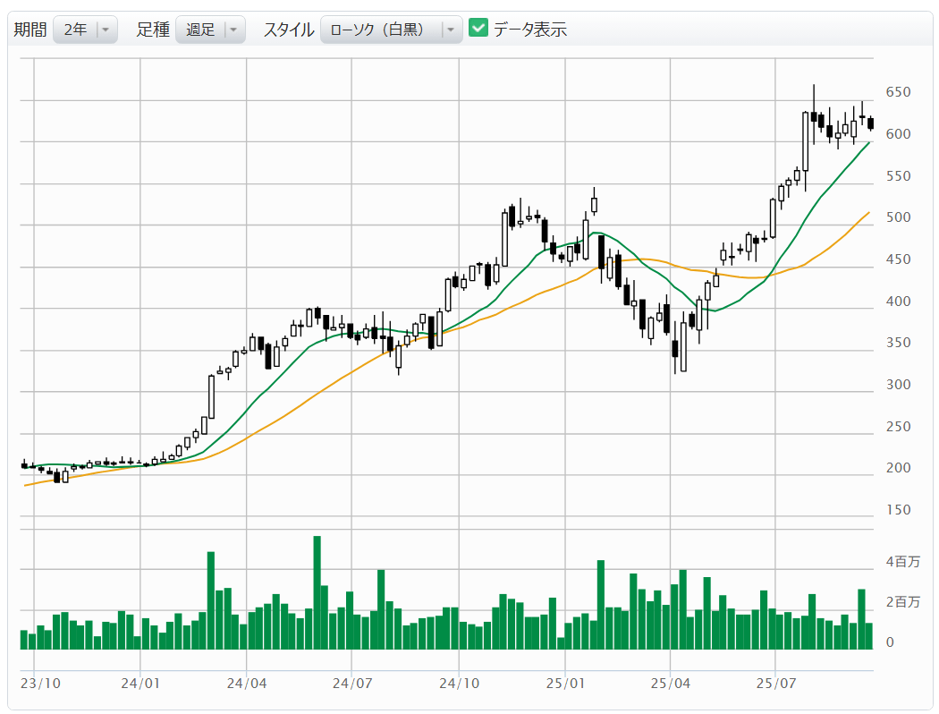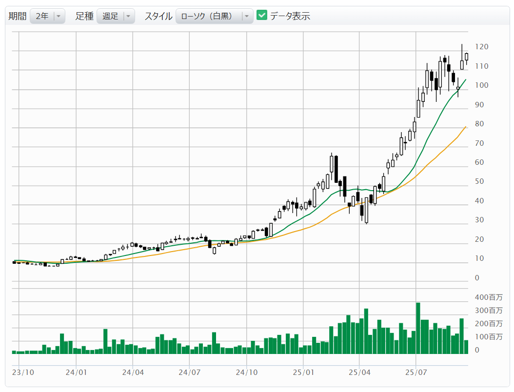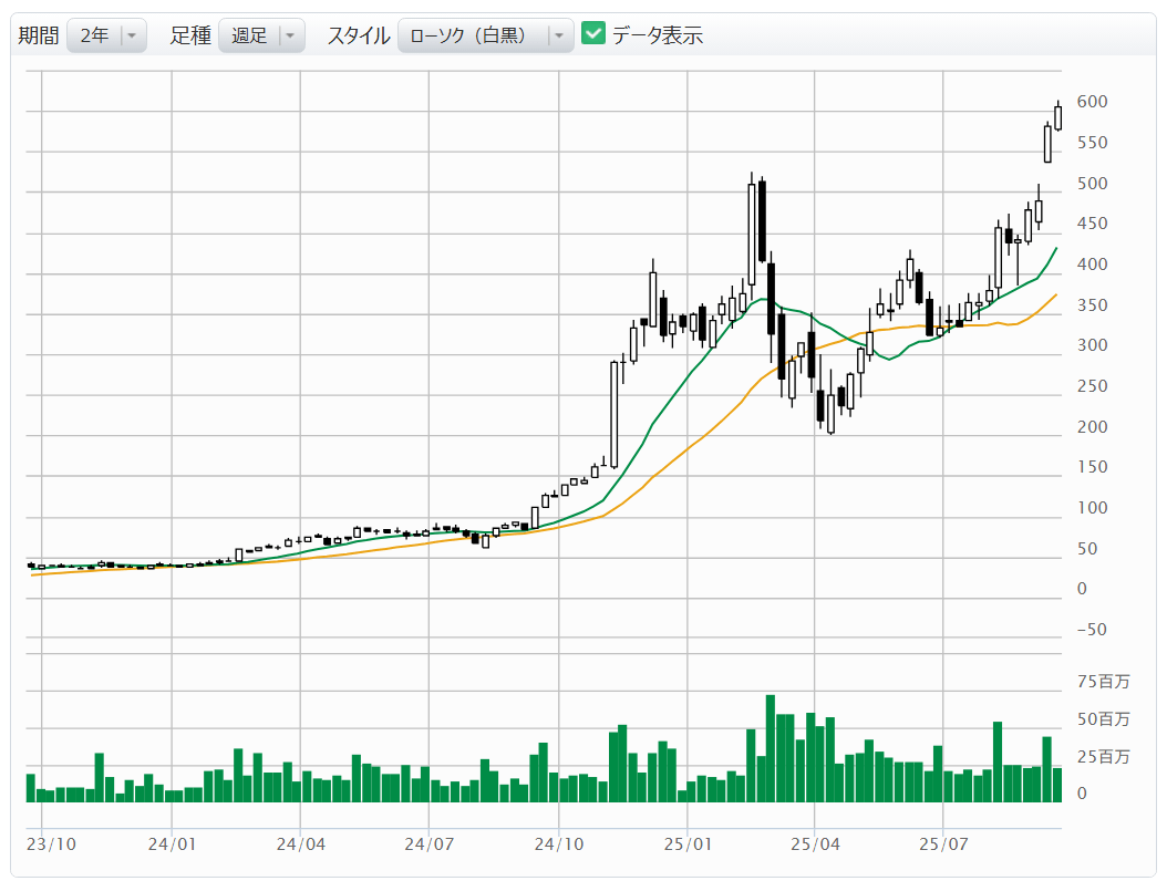 株価は9月半ばまで連日のように上場来高値を更新しており、2022年12月につけた安値9.30ドルから3年足らずで60倍以上に急騰しています。