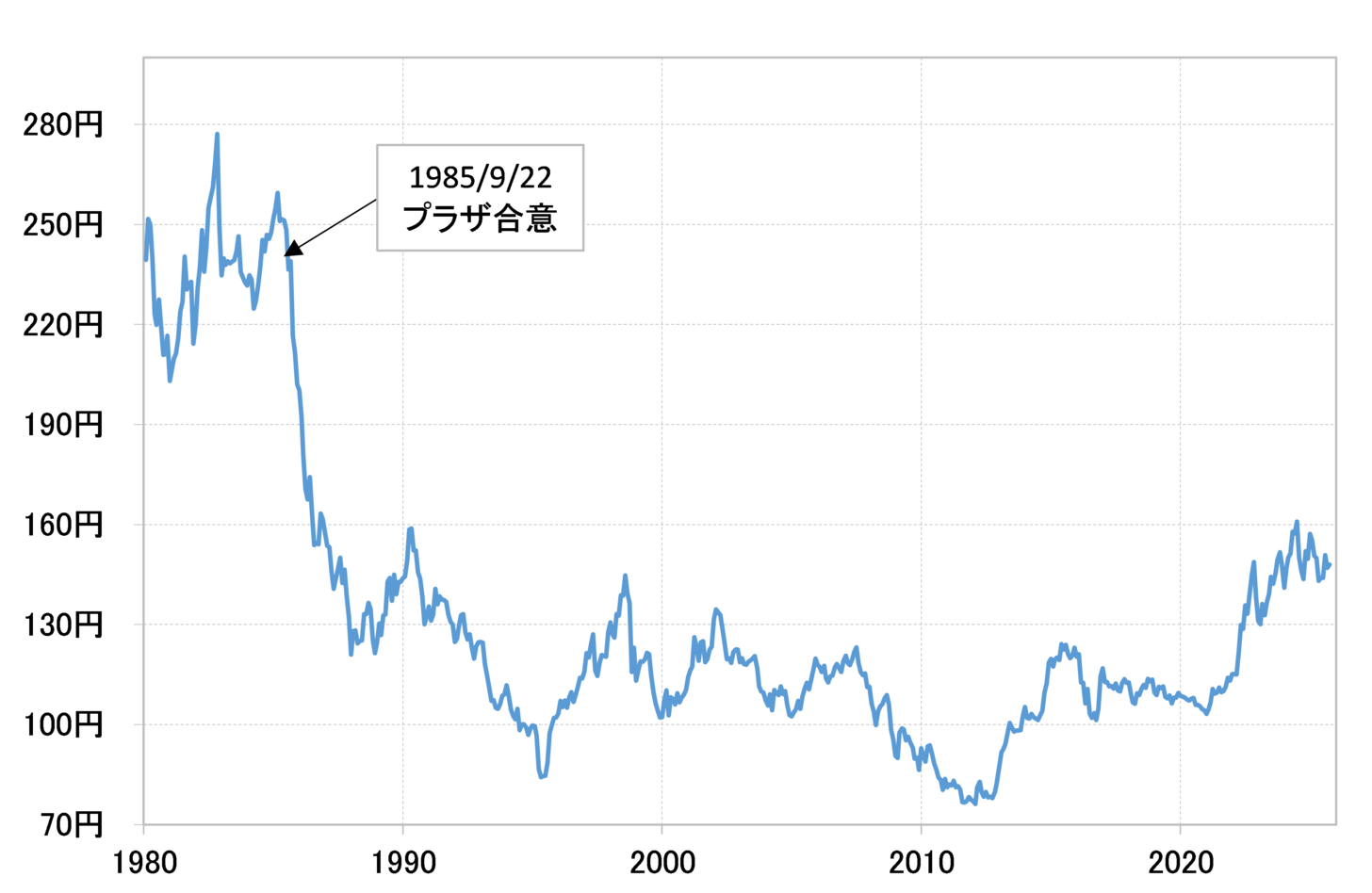 一度動き出した米ドルの下落は、すでに通貨当局が米ドル売り介入を止めた後も止まらず、1986年になると、200円から一気に150円割れに向かう動きとなった。それは明らかに、プラザ合意が想定した米ドル安誘導を超えた動きだった。