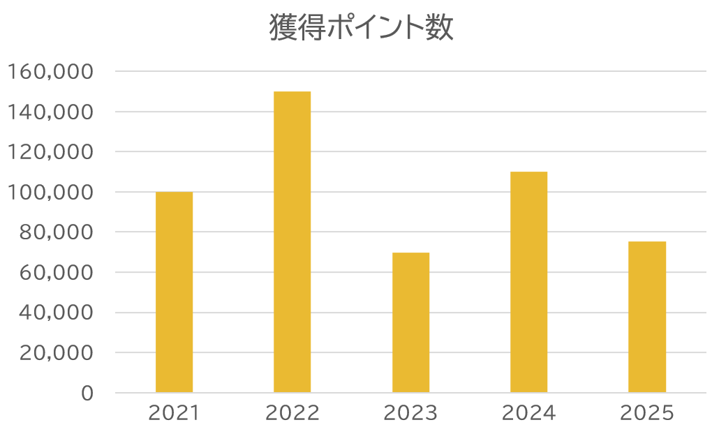 2023年は69,711ポイント、2024年は約11万ポイント。2025年は8月までで75,384ポイント獲得しました。月に9,000円相当くらいのポイントをコンスタントに得られています。