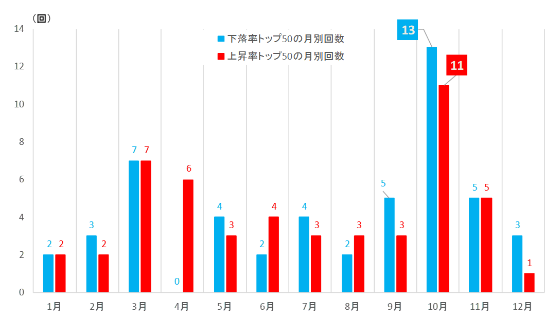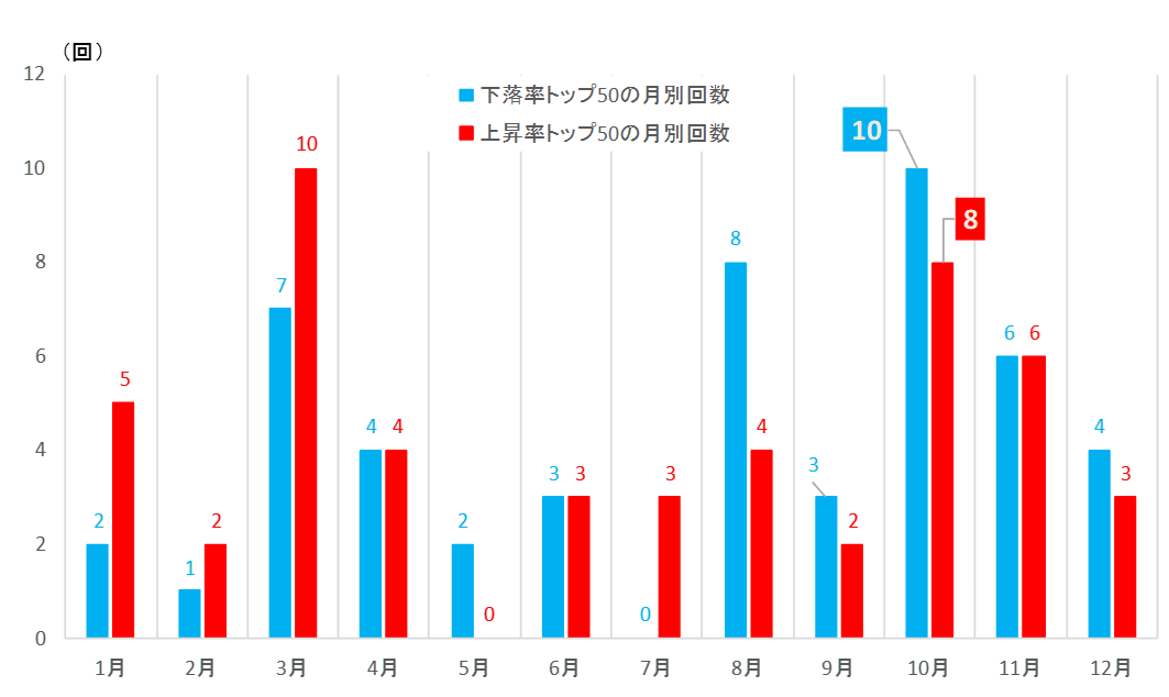 先ほどは下落率上位50日の月別回数を見ましたが、反対に上昇率上位50日の月別回数を集計しました。図表2の赤棒グラフから過去の上昇率上位50日のうち8日間が10月に発生していることが示されます。3月の10日には及びませんが、他の月と比べて2番目に多い月です。