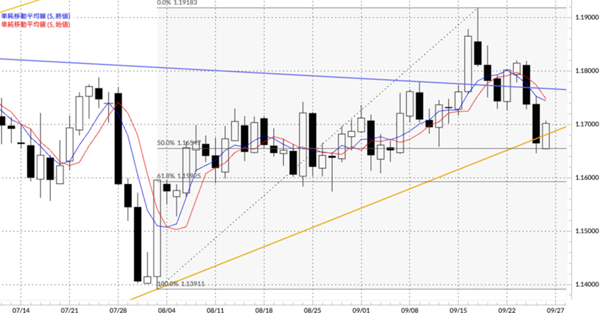 先週(9月22日週)のユーロ/米ドルは、米ドル/円同様に米金利上昇による米ドル高(ユーロ安)の動きが続いたと言えます。ただ、ユーロ/米ドルに関してもECB(欧州中央銀行)の利下げサイクルが終了した一方で、FRBが年内2回の追加利下げを行えば米欧金利差は縮小方向となります。そのため、ユーロ買いに繋がりやすい流れがどこかで出てくる可能性はあるとみていた方が良さそうです。