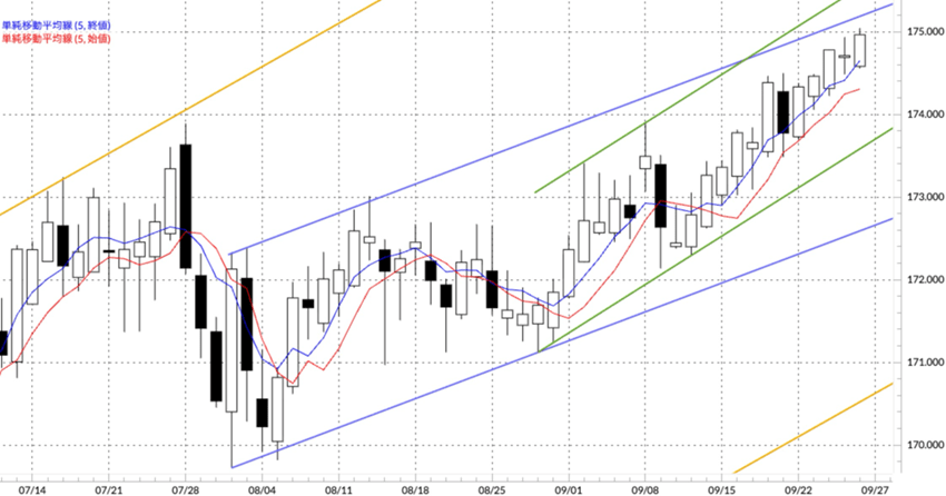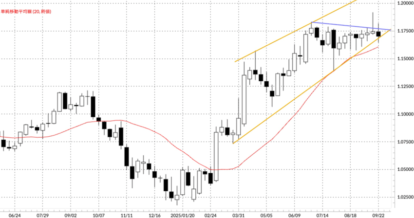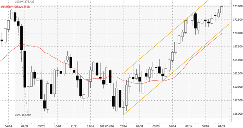 またユーロ/円はじり高の一週間となり、9月26日には175.046円と175円の大台を超えて年初来高値を更新しました。日欧金利差で考えると日銀の年内追加利上げはほぼ確実でしょう。ユーロ/円も中期的には調整が入る可能性は高いのですが、2024年高値175.422円が近いこともあり、現状は2024年高値をトライしたいという力の方が強そうです。仮に高値を超える動きが今週以降出てくれば達成感による反落につながるのではないでしょうか。