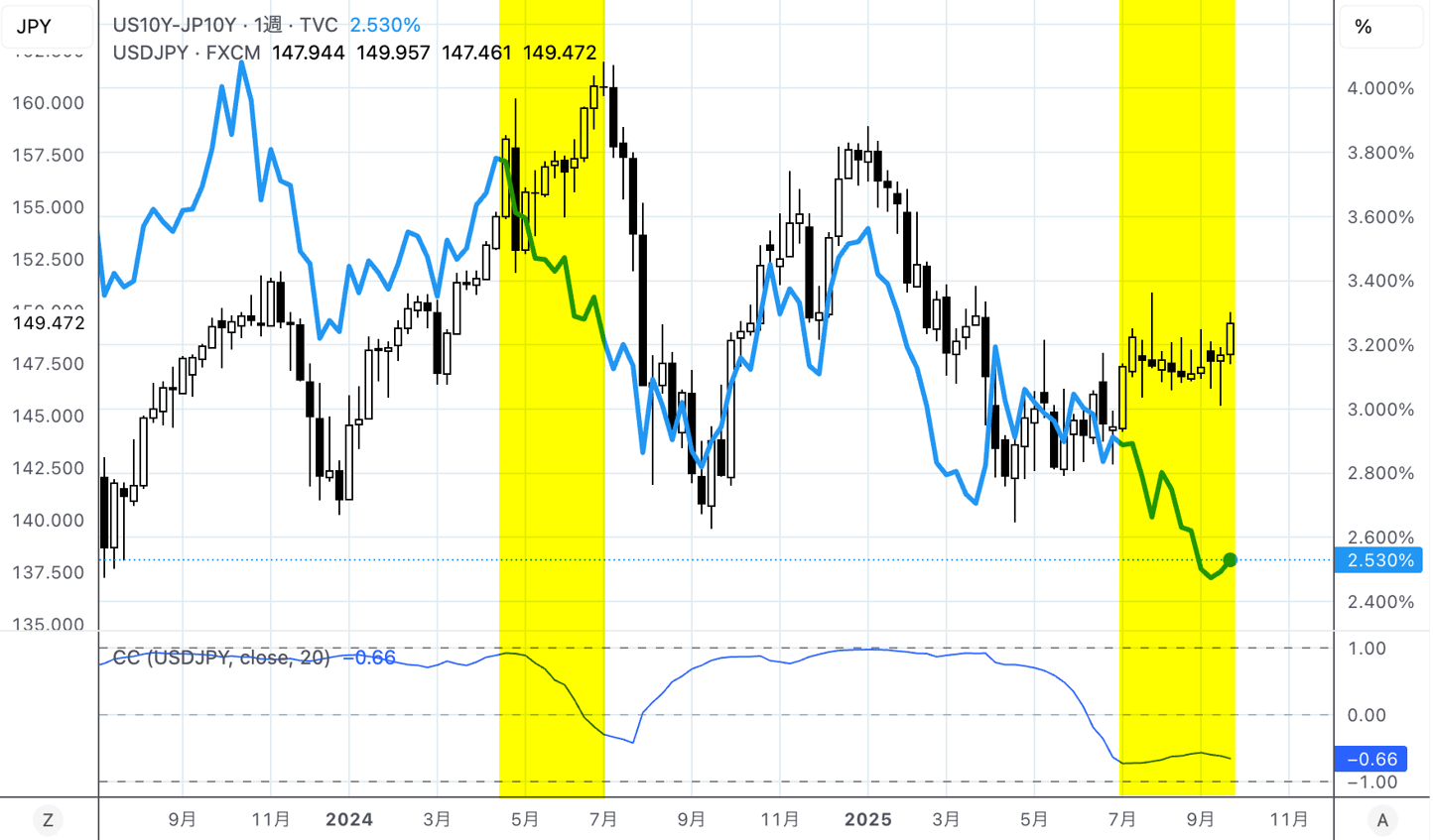 これは米金利上昇による米ドル買い戻しで短期的なものですが、長い目で見ると米金利は今後も低下傾向を辿り、日米金利差は縮小する方向です。一方で米ドル/円は米ドル買いが根強く、金利差と米ドル/円の値動きには乖離が出ています。