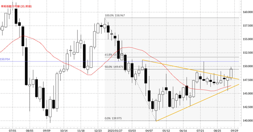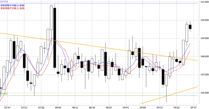 週足チャート(図表2)では、三角もちあい(黄色のサポートとレジスタンス)を先週終値で上抜ける動きとなってきました。テクニカルには米ドル一段高を考えることになるのですが、150円の大台間近と悩ましい水準にあります。今週(9月29日週)は四半期末と米国雇用統計の発表も控えているため、更なる米ドル買いには動きにくいというところです。現在の底固い地合いが続いた場合、次のターゲットとしては7月高値150.914円(青の水平線)があげられます。