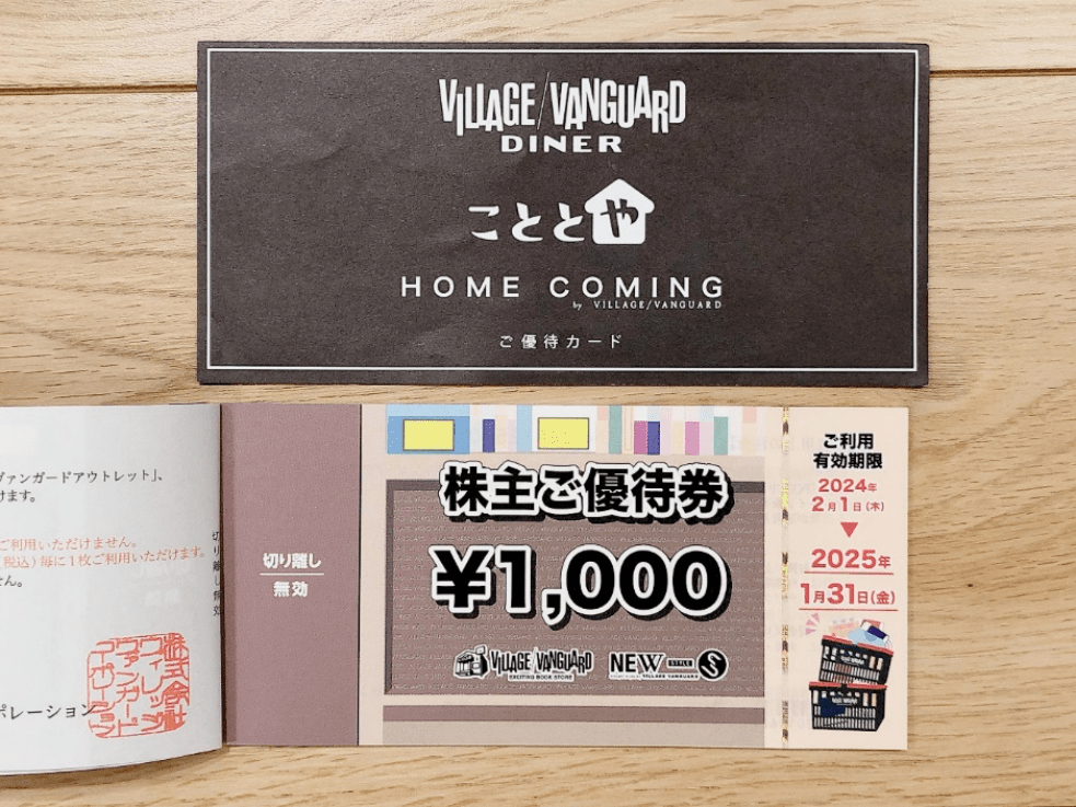 | ヴィレッジヴァンガードコーポレーション | (2769) | 1,021円 | 100株 | 102,100円 | 10,000円相当の買物券(1,000円×10枚) 100株以上 ※自社店舗(一部除く)で2,000円(税込)以上の買物につき2,000円(税込)ごとに1枚利用可 ※1年以上2年未満継続保有(株主名簿に連続3回以上5回未満記載)の株主には1枚、2年以上(連続5回以上記載)は2枚追加 |