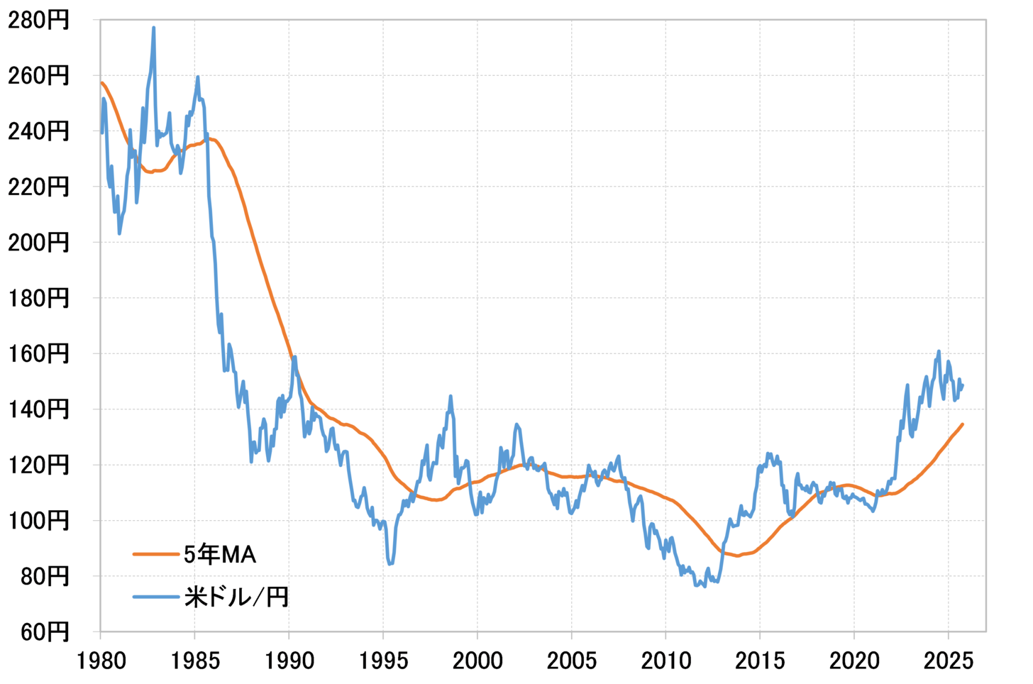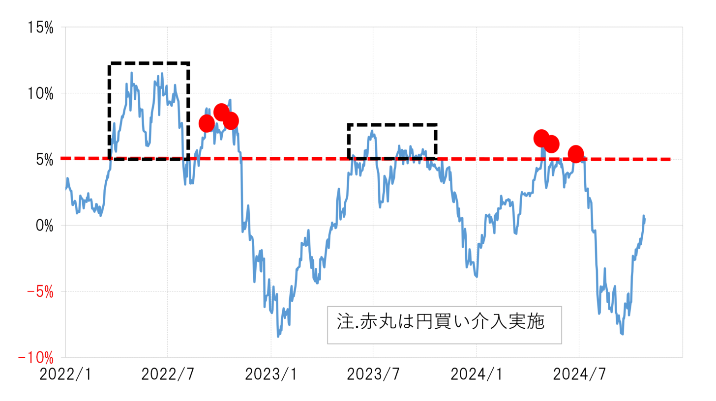 財務省が公表している資料によると、今回の円安局面での米ドル売り介入は、2022年9、11月、そして2024年4~5月、7月に行われた。この米ドル売り介入の開始は、2022、2024年とも米ドル/円が5年MA(移動平均線)を2割以上上回る中で行われたものだった。