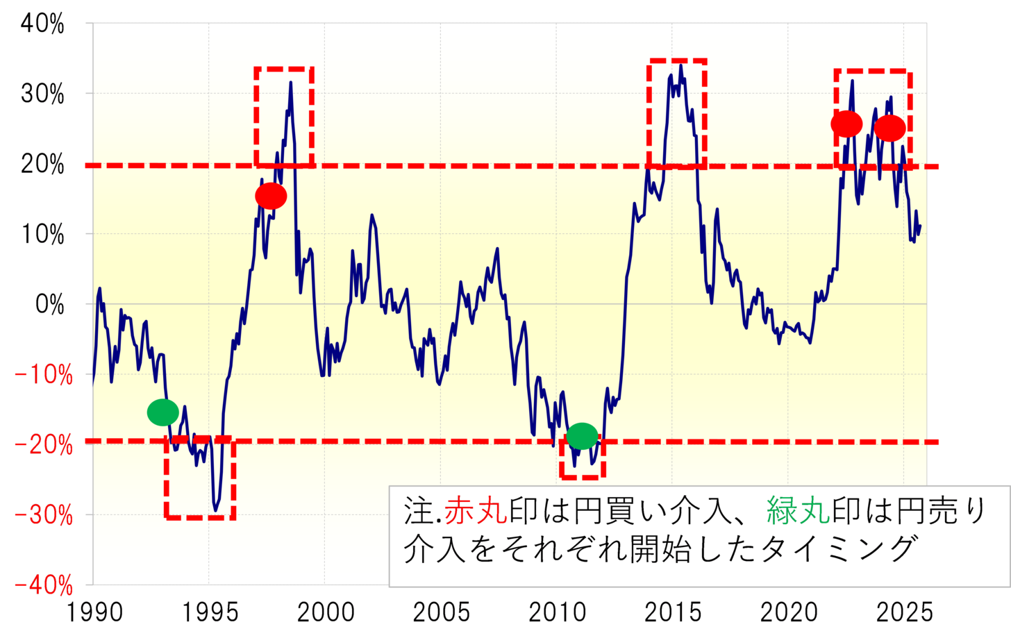 同じように、米ドル/円が5年MAを2割以上上回ったのはそれまでに2回、反対に2割以上下回ったことも2回あった。この4回のうち3回は米ドル売り、ないし米ドル買いの介入が行われていた(図表1参照)。唯一の例外は2015年にかけて展開した米ドル高・円安局面で、これは安倍第二次政権の経済政策「アベノミクス」を受けた動きだった。