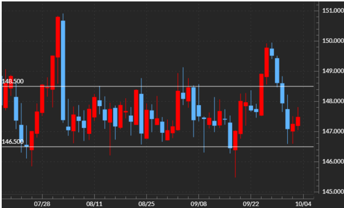 米ドル/円は先々週(9月22日週)、約1ヶ月半も続いた小動きを「上放れ」、150円に迫る動きとなりました。しかし、先週(9月29日週)は一転して下落に向かい、一時は146円半ばまで下落しました。結果的には9月22日週の「上放れ」は一時的な動き、いわゆる「ダマシ」となり、元の小動きのレンジに戻るところとなったのです(図表1参照)。