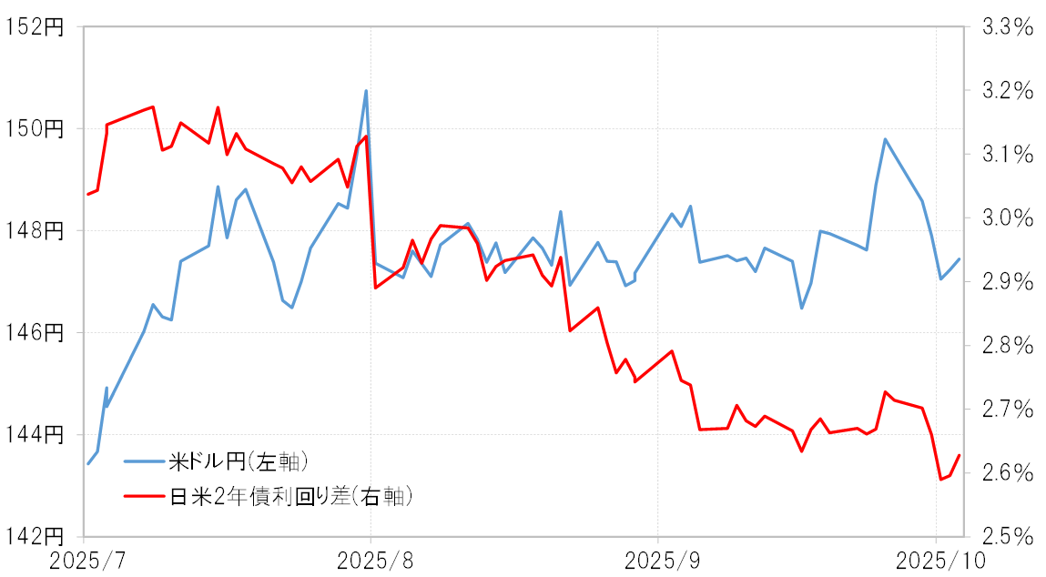 先週(9月29日週)米ドル/円が下落に転じた理由は、米政府機能が一部停止、いわゆる「シャットダウン」となったことを受け、米景気への悪影響への懸念から米金利が低下したこと、一方で日銀関係者の発言などから10月の日銀利上げ期待が高まり日本の金利が上昇したことなどがきっかけとされました。