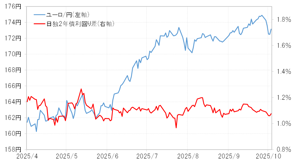 金利差円劣位縮小へ円高反応せず、金利差円劣位からかい離した円安が広がったのは、米ドル/円以上にユーロ/円などの方がより分かりやすかったともいえるでしょう。ユーロ/円は一時、2024年7月に記録した最高値に迫る175円台まで上昇しましたが、これは全く日独金利差(ユーロ優位・円劣位)で説明できないものでした(図表4参照)。