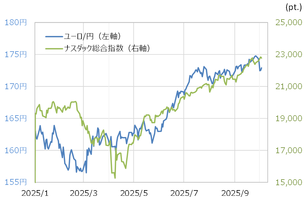 金利差で説明できないユーロ/円の上昇は、ナスダック総合指数など最高値を更新する株価の動きに沿ったものに見えました(図表5参照)。以上のように、これまで円高への反応が鈍かったところから、先週急に円高へ比較的過敏な反応となったのは、金利差への追随より、一時的でしたが株安になった影響が大きかったのではないでしょうか。