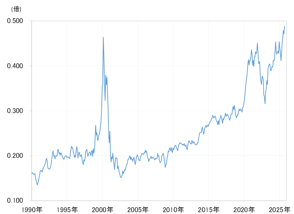 9月下旬に、パウエルFRB(米連邦準備制度理事会)議長が、「株価はかなり割高になっている」と、FRB議長としては異例の株価への言及がありました。実際に、NYダウに対するナスダック総合指数の割高は、2000年のITバブルのピーク以上に拡大しています(図表6参照)。これはAIブームなどの「行き過ぎ」を懸念させるものではないでしょうか。そういった「行き過ぎ」の反動で株高が変化するかを引き続き注目したいと思います。