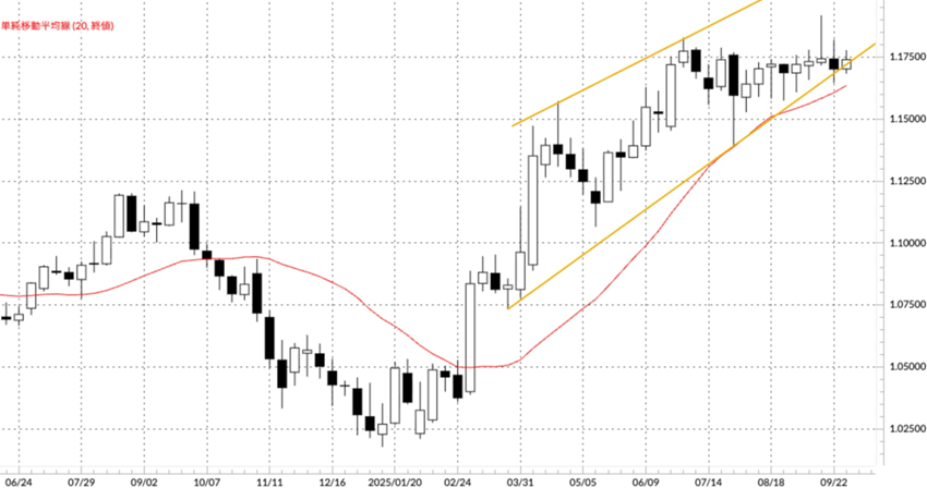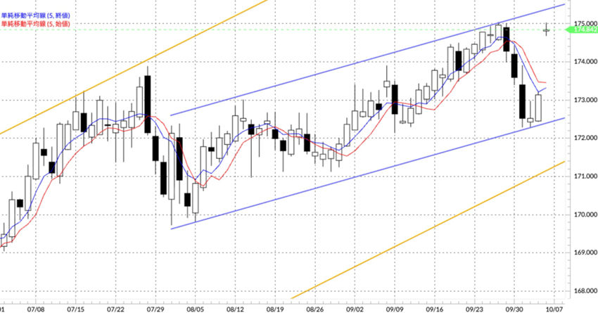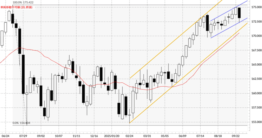 ユーロ/円は9月22日週につけた年初来高値(175.046円)に今朝10月6日のギャップアップの動きで目前まで迫ってきています(執筆時点の高値は175.030円)。2025年の高値よりは2024年高値(175.422円)のほうが重要度は高く、同水準を試すかどうかを今週は見極めることとなるでしょう。また現在の動きは青の平行上昇チャンネルの中での動きと考えられますので、2024年高値を更新後に達成感でいったん反落という動きがもっともありそうな動きでしょうか(図表5)。