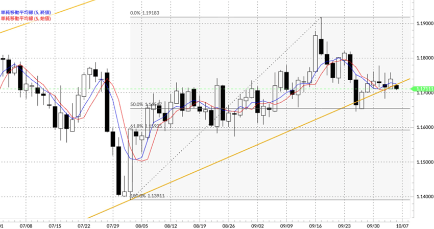 週足チャート(図表3)は年初来高値を更新後に黄色のラインの上昇ウェッジの中で下側のサポートラインを試そうとする動きが出てきました。週初早朝の米ドル/円での米ドル高の動きがややユーロ/米ドル下押しの動きとなっていることから今週はこのサポートを維持できるかどうかを見極める週となります。さらにその直下には週足移動平均線も位置していますので、今週(10月6日週)に限らず10月はユーロにとってテクニカルには重要な時期となってきたと思います。