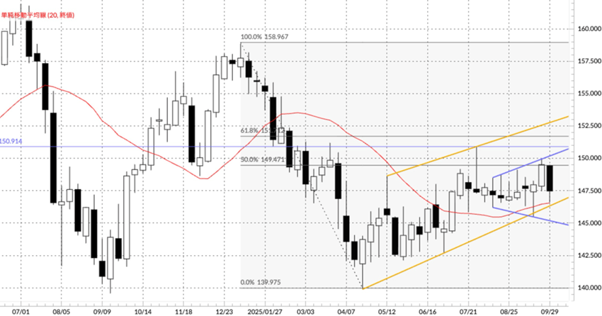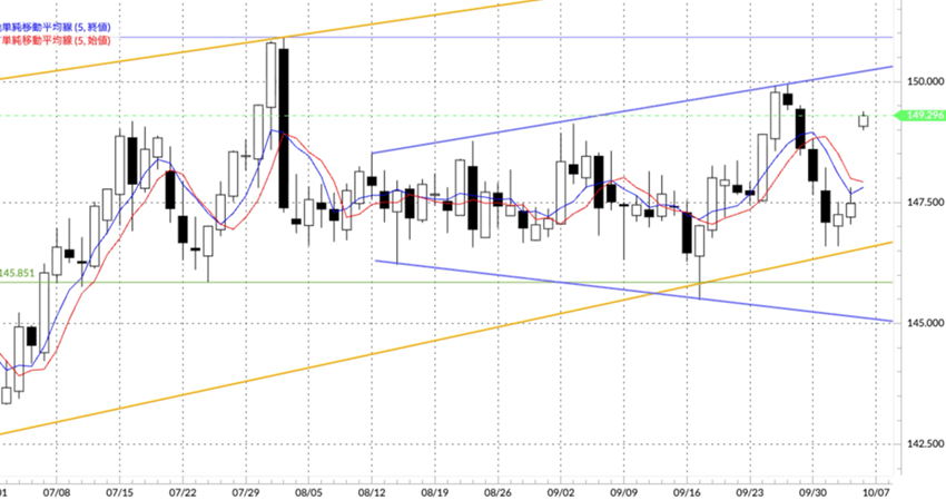 10月3日は東京朝方に植田日銀総裁がこれまで通りではあったものの、ややハト派な発言をしたことをきっかけに株高・円安の動きとなりました。しかし米政府機関閉鎖により雇用統計の発表もないこと、また10月4日には自民党総裁選が控えていることもあり、147円台半ばで方向感がはっきりしないままに引けました。