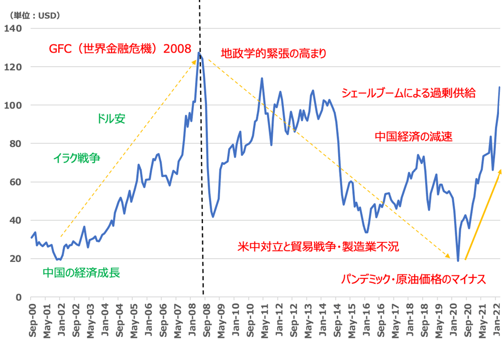 その後、2008年の世界的な景気後退は、欧州(2011年)と中国(2015年)のさらなる減速と相まって、コモディティ価格を下押しし、トランプ政権時代の「貿易戦争」やそれに続く世界的な製造業の不況、そして原油価格を史上初めてマイナスの領域に送り込んだ悲惨なパンデミックを経て、12年のダウンサイクル(価格下落サイクル)の終わりを告げたと見ている。