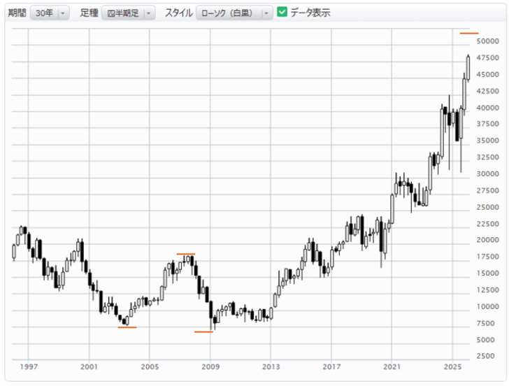 また、長期で日経平均の動きを考えるときに値幅の基準になるのが、2003年と2008年の安値約7,000~7,600円と、その間の2007年高値18,300円水準との値幅のざっくり1万1,300円。これをベースに4層倍という観点でいくと、52,000円前後が挙げられます。