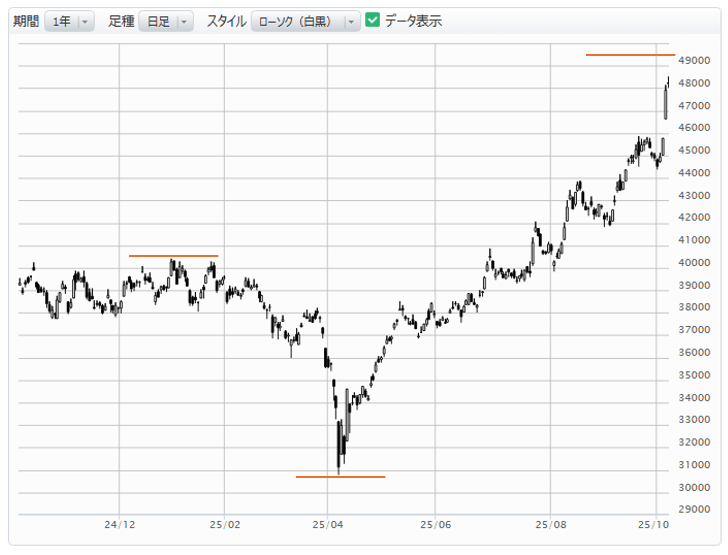 日経平均株価は5万円の大台替わりが視野に入ってきました。週明け10月6日の東京株式市場は「高市トレード」による円安、株買いが強まる展開となり、2,175円高(+4.75%)と大幅高となりました。高市勝利は十分に描かれていたシナリオでもありましたが、高値圏にあった日経平均を勢いづかせる結果となりました。