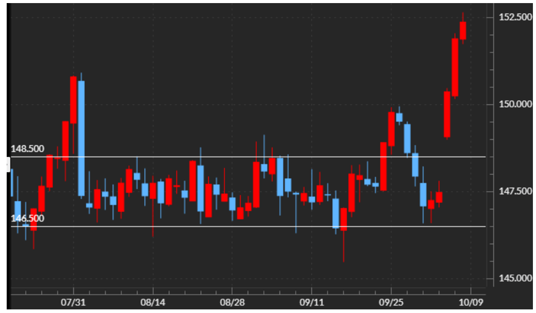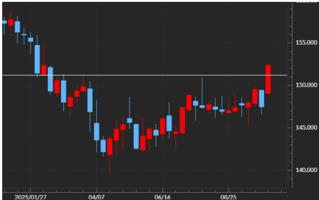 自民党の高市新総裁誕生を受けて、米ドル高・円安が急拡大した。これは、テクニカルに見ると長く続いた米ドル/円の小動きを「上放れ」したことの影響が大きいということではないか。