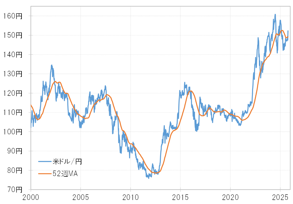 高市新総裁誕生をきっかけとした米ドル高・円安の急加速により、米ドル/円は足下で149円程度の52週MA(移動平均線)を大きく上回ってきた(図表4参照)。経験的に米ドル/円下落トレンドが続く中でのあくまで一時的な上昇なら、52週MAを5%以上大きく、1ヶ月以上長く上回る可能性は低い。
