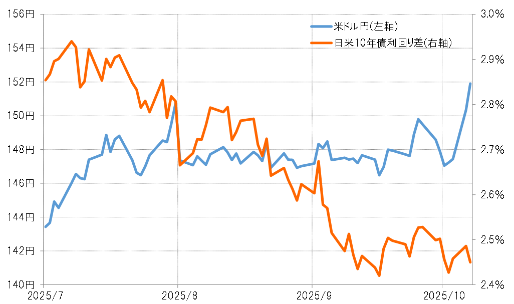 米ドル/円は、自民党総裁選までの約2ヶ月も、何度かいわゆる「ダマシ」はあったものの、基本的には146円半ば~148円半ばと約2円の狭いレンジで方向感のない展開が続いていた(図表1参照)。普通、小動きが長く続くほど相場のエネルギーが溜まり、小動き終了後は溜まったエネルギーの発散で一方向へ大きく動きやすい。今回の場合は、高市新総裁誕生が米ドル/円「上放れ」のきっかけとなり、米ドル高・円安が急加速したというのが基本ではないか。