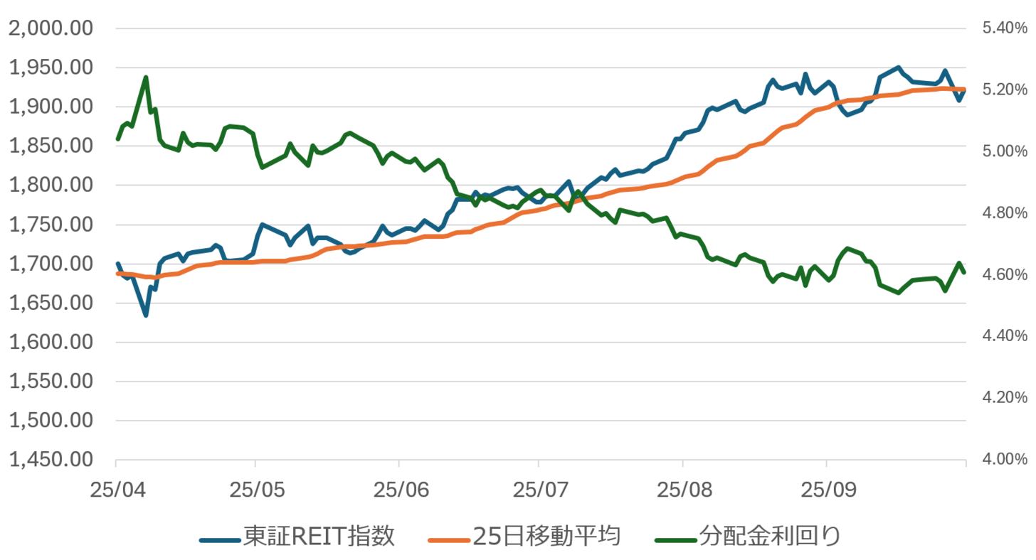 7月、8月と2ヶ月連続で全面高とも言える値動きであったが、9月には一服した。東証REIT指数の25日移動平均で見ても、9月中旬以降は1920ポイント程度で横ばいの推移となっている。
