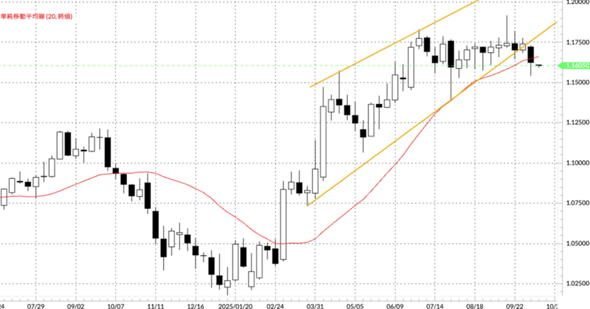 米ドル/円は10月1日安値を目先の底に高市トレードによる大幅な円安となったことから10月6日にはゴールデン・クロス(GC)が発生しました(図表2)。その後も円安は進行しましたが10月10日の高値が目先の高値となりました。首班指名がどうなるのか、円安再開には高市首相が誕生する必要があるという状況です。仮に野党から首相が誕生となると高市トレードの更なる巻き返しが出る可能性もありますので、今週(10月14日週)の各党の動きが重要です。