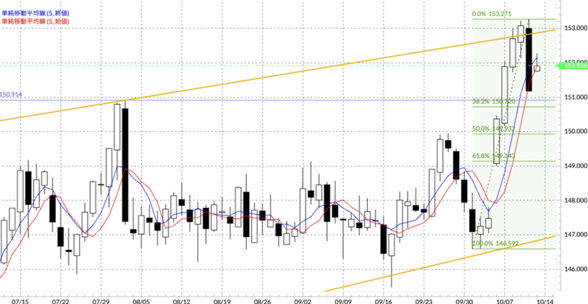 高市新総裁の経済ブレーンである本田元内閣官房参与が「150円超えはやや行き過ぎ」と話したことで一時的な押しも見られましたが、同時に日銀の10月利上げは困難という見方に引っ張られた感が強く、その後も円安地合いは変わらず。海外勢を中心に長期的な視点から円売りに動く向きが多く、この流れは10月10日東京前場まで続き、10月10日朝方には153.271の週間高値をつけました。