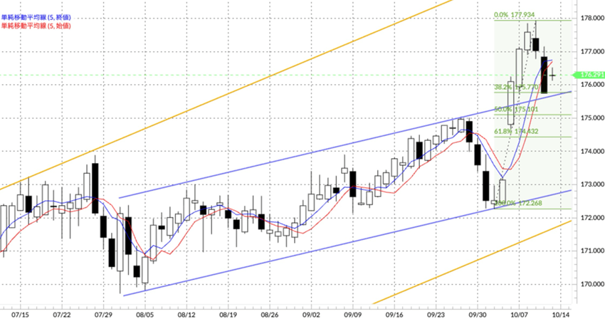 なお、今回の下げは直近安値と高値との38.2%押し175.770円で下げ止まっていること、またこれまでの平行上昇チャンネルの上側のラインが同じ水準にあることから、短期的にはいったん下げ止まりという可能性の方が高いように思えます。ただし、円相場を取り囲む状況を考えると、今週は柔軟に動かなくてはならない週と言えるでしょう。