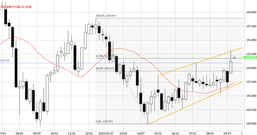 先週(10月6日週)の米ドル/円は、10月4日投開票の自民党総裁選で勝利した高市氏が積極財政派で金融引き締めに否定的なことから、週明け早朝の株式市場は大幅高、為替市場の米ドル/円相場は円大幅安でスタートしました。米ドル/円は10月3日終値147.481円からギャップアップして149.075円で始まり、10月6日のうちに150円の大台をあっさりと突破する激しい動きを見せました。