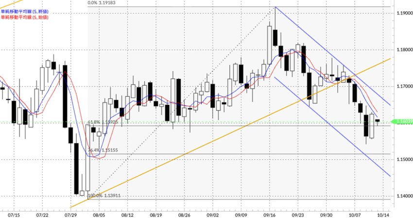 先週(10月6日週)のユーロ/米ドルは、10月6日にフランスのルコルニュ首相が辞任。就任からわずか1ヶ月、組閣から15時間未満とフランス近代史上最も短命な政権となりました。前週に上値が重く戻りが弱かったユーロ/米ドルの絶好の売り材料とされました。米ドル/円とともにユーロ/円でも円売りが入っていたことから当初の下げは限定的ではあったものの円売りの動きとともにユーロ売りも強まり、10月9日には1.15422ドルと8月5日以来の安値をつけました。10月10日NY市場では米国の対中追加関税の発表があったことから1.16ドル台前半へと戻しました。