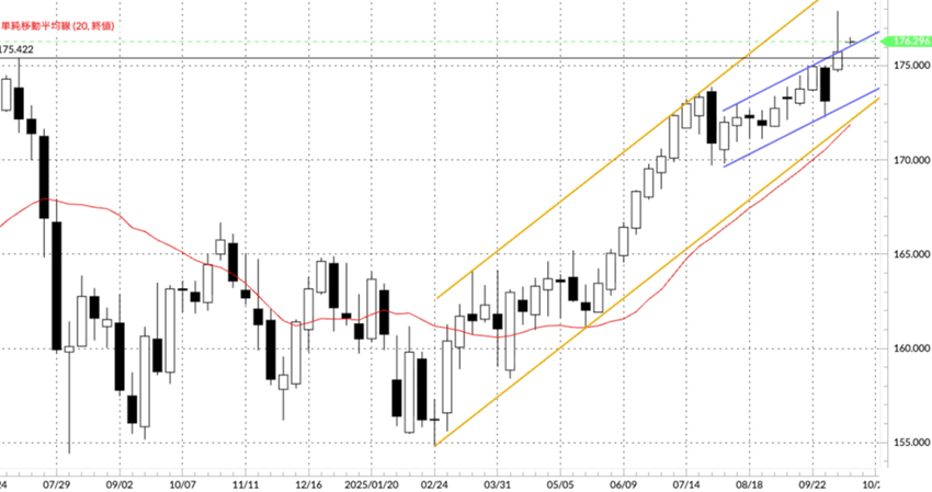 週足チャート(図表1)では、黄色いライン(長期)で示されるほぼ上昇チャンネル(ウェッジ)の中での動きが続いています。10月10日(金)に高値で上側ラインをトライしようとしたところで海外市場の下げでチャンネル内に押し戻された格好です。